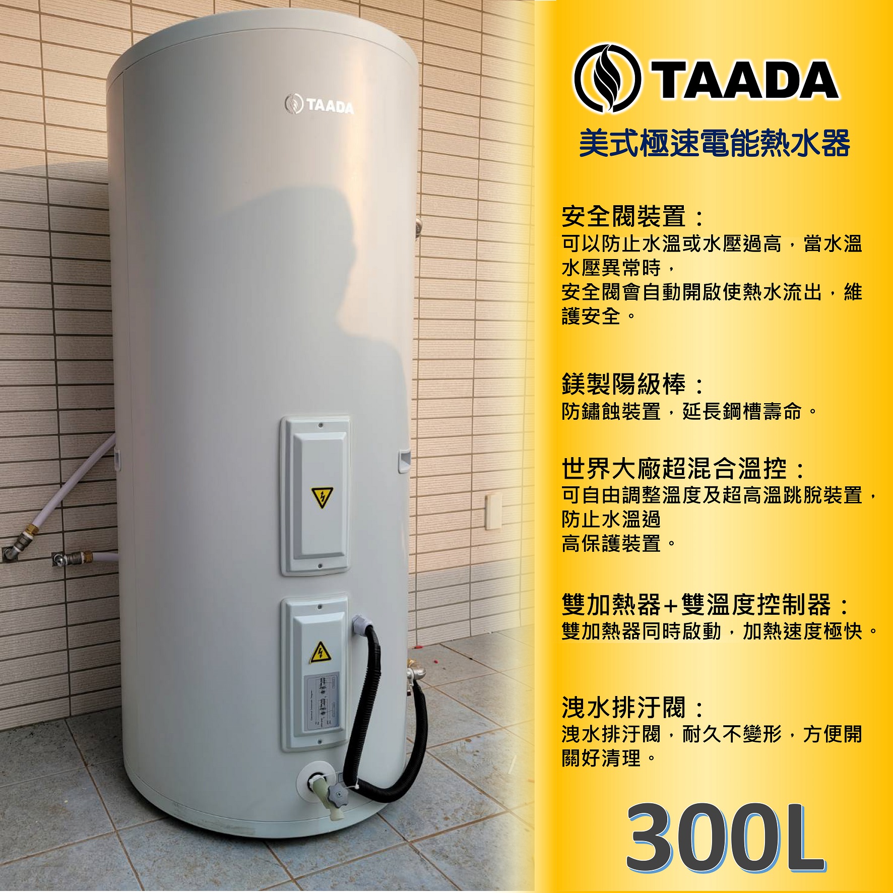 各種容量完整支援,台灣製造內外不鏽鋼製製造,加熱器可因不同環境水質更改功率以及材質。橫臥式、直掛式、落地式以及瞬儲式產品選擇多元,每台精湛不鏽鋼電熱水器均有TGAS台灣區瓦斯公會保險認證,讓您安心放心。